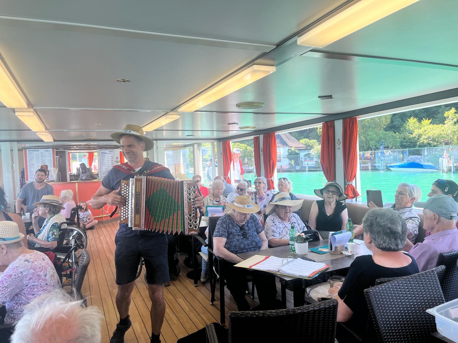 Gesagt, getan – es wurde ein großer Bus bestellt und schon ging die Reise los. Bei traumhaften Sommerwetter und einem hauseigenen Musikanten genossen die Ausflügler:innen den ereignisreichen Nachmittag auf dem Schiff. Nach der lustigen Schifffahrt ließen sich noch alle bei einem gemeinsamen Mittagessen verwöhnen. Sehr müde, aber glücklich und mit schönen Erinnerungen im Gepäck, kam die unternehmungslustige Runde wieder heim.